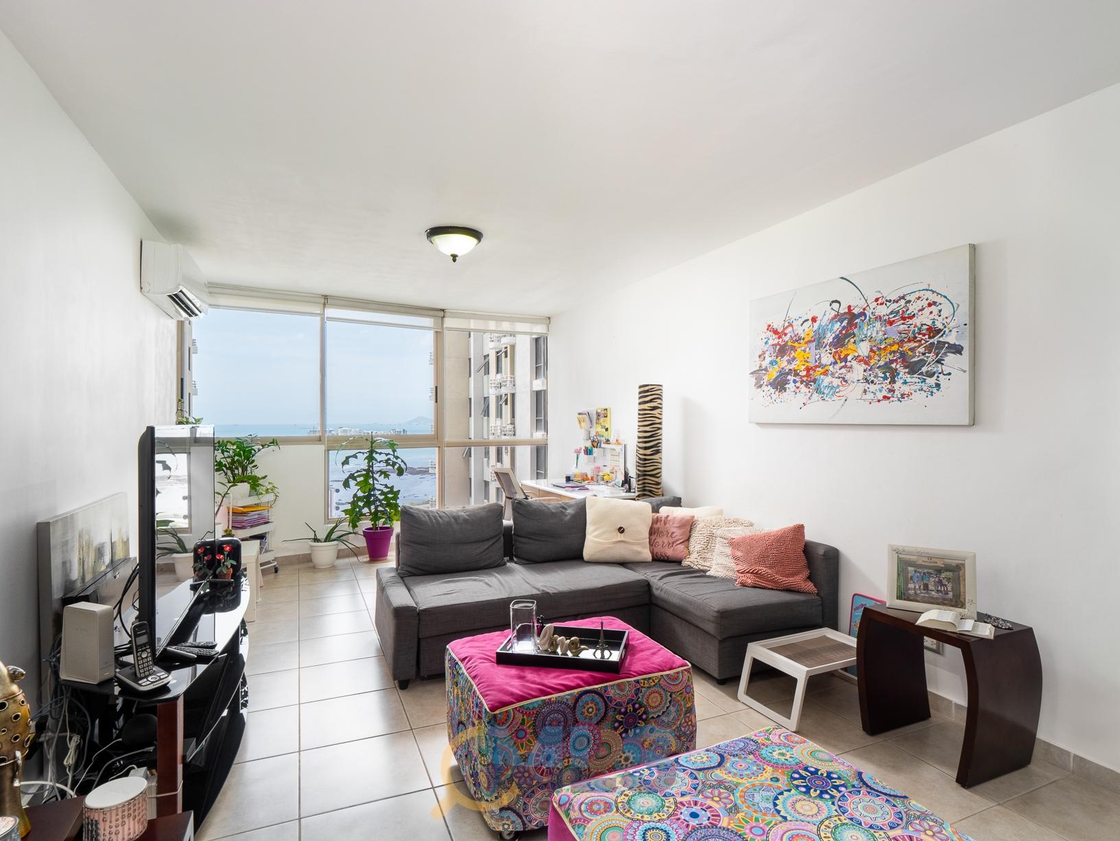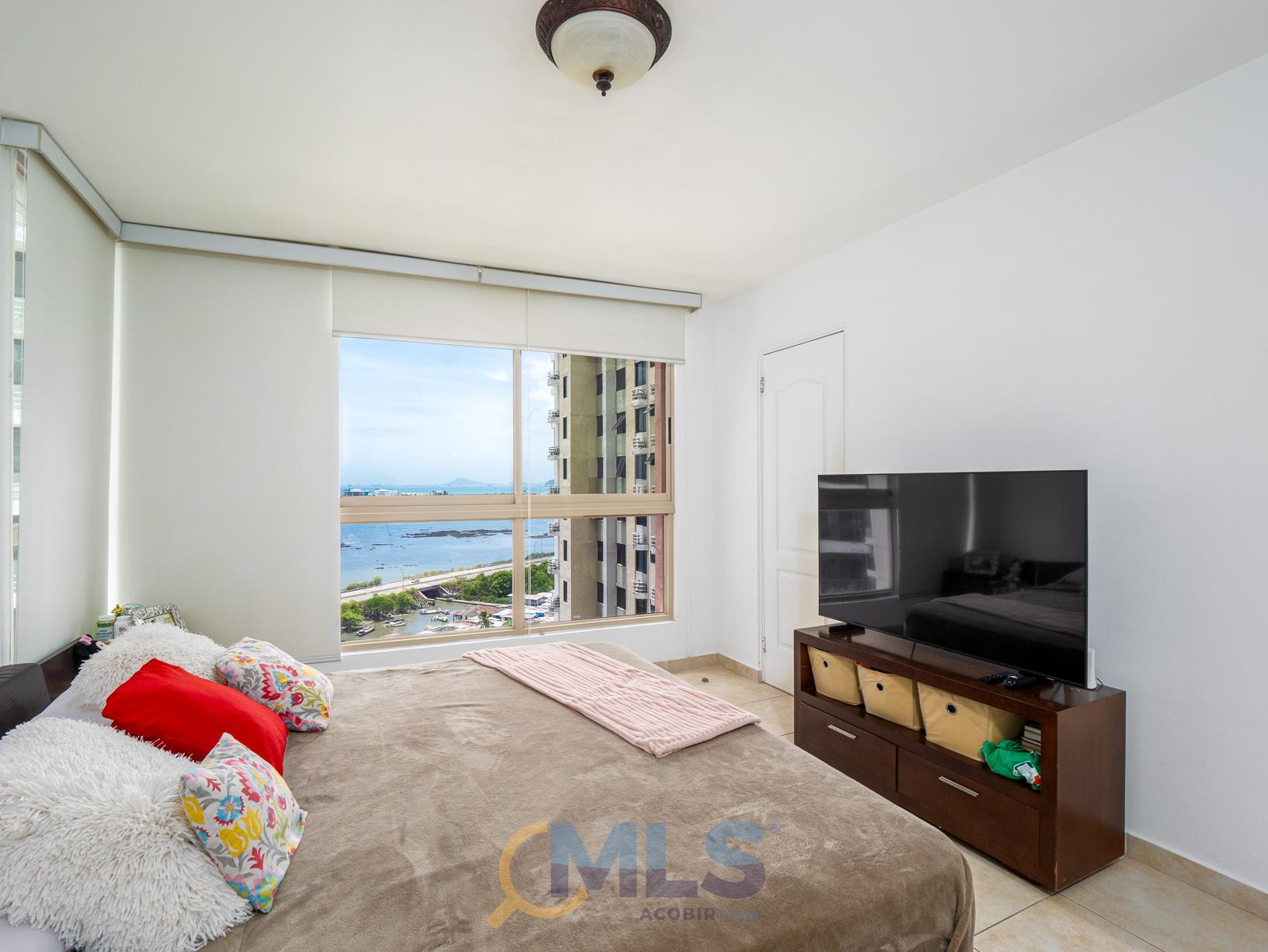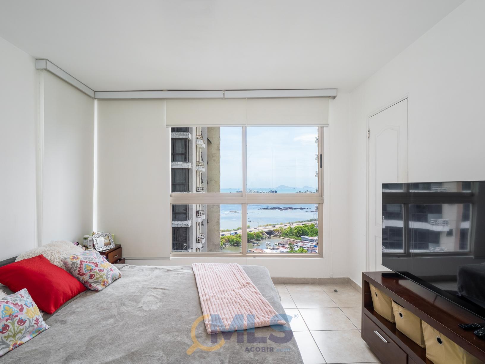 Apartamento para venta en PH San Francisco Bay, con 2 estacionamientos, vistas parciales al mar y cuarto y baño de servicio. Modelo 113 m2, con: Amplia Sala-comedor. Ventanales con vista parcial al mar. 2 recámaras, principal con baño privado y walk-in closet. Baño secundario completo. Cocina en muy buen estado. Lavandería. Cuarto y baño de servicio- Cuenta con 2 estacionamientos, incluye línea blanca, aires y algunos muebles. Se vende para vivienda o si lo desea, también como inversión con excelente inquilino. El conjunto San Francisco Bay, cuenta con 5 torres con 2 garitas de accesos desde la Vía Israel, y Punta Pacífica. La torre 100 y 200 comparten un área social con piscinas para adultos y niños, terraza techada con área para BBQ, Cancha de Tenis, Juegos infantiles. Cada torre cuenta con su gimnasio privado, salón de fiestas y un pequeño playground para los más pequeños.