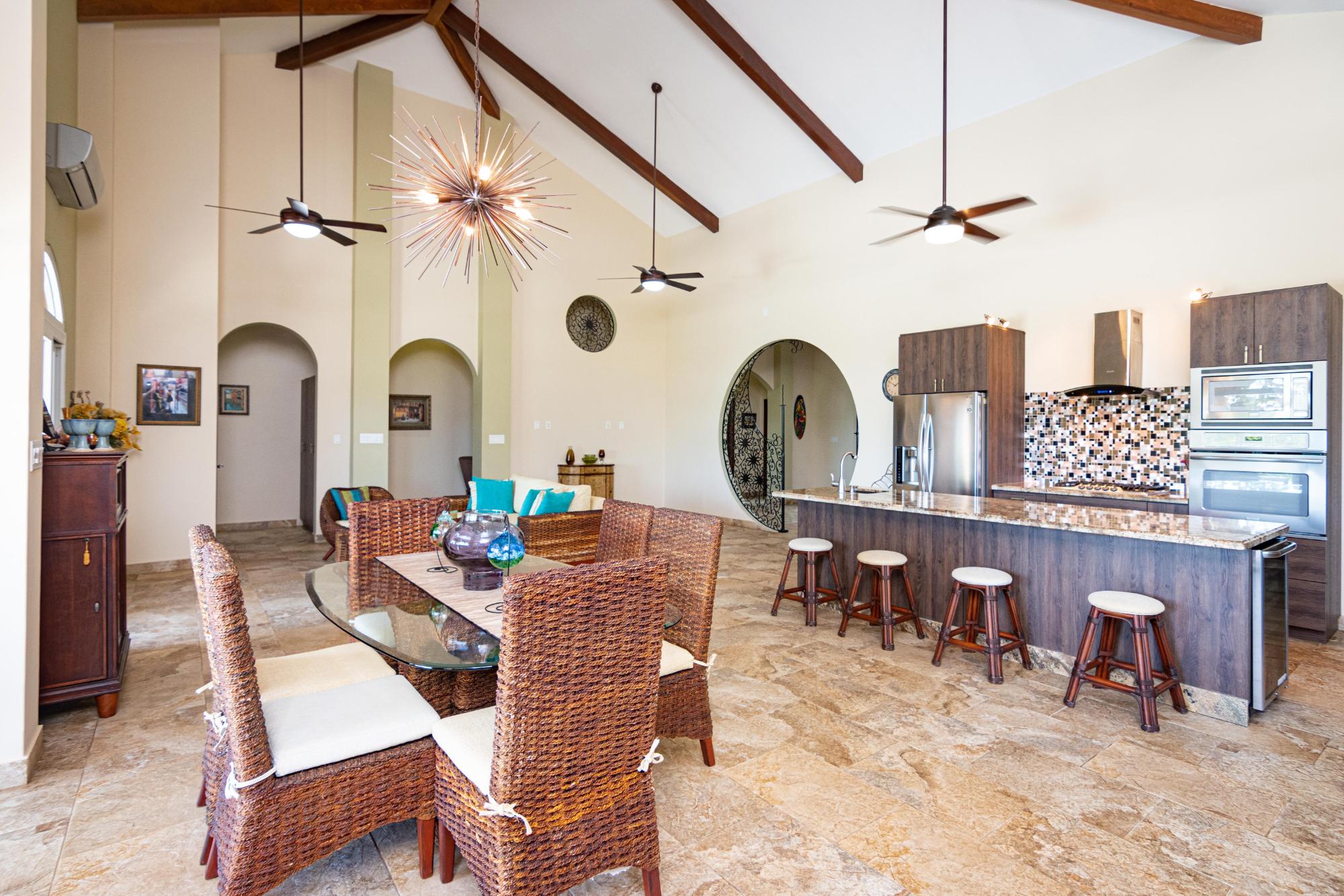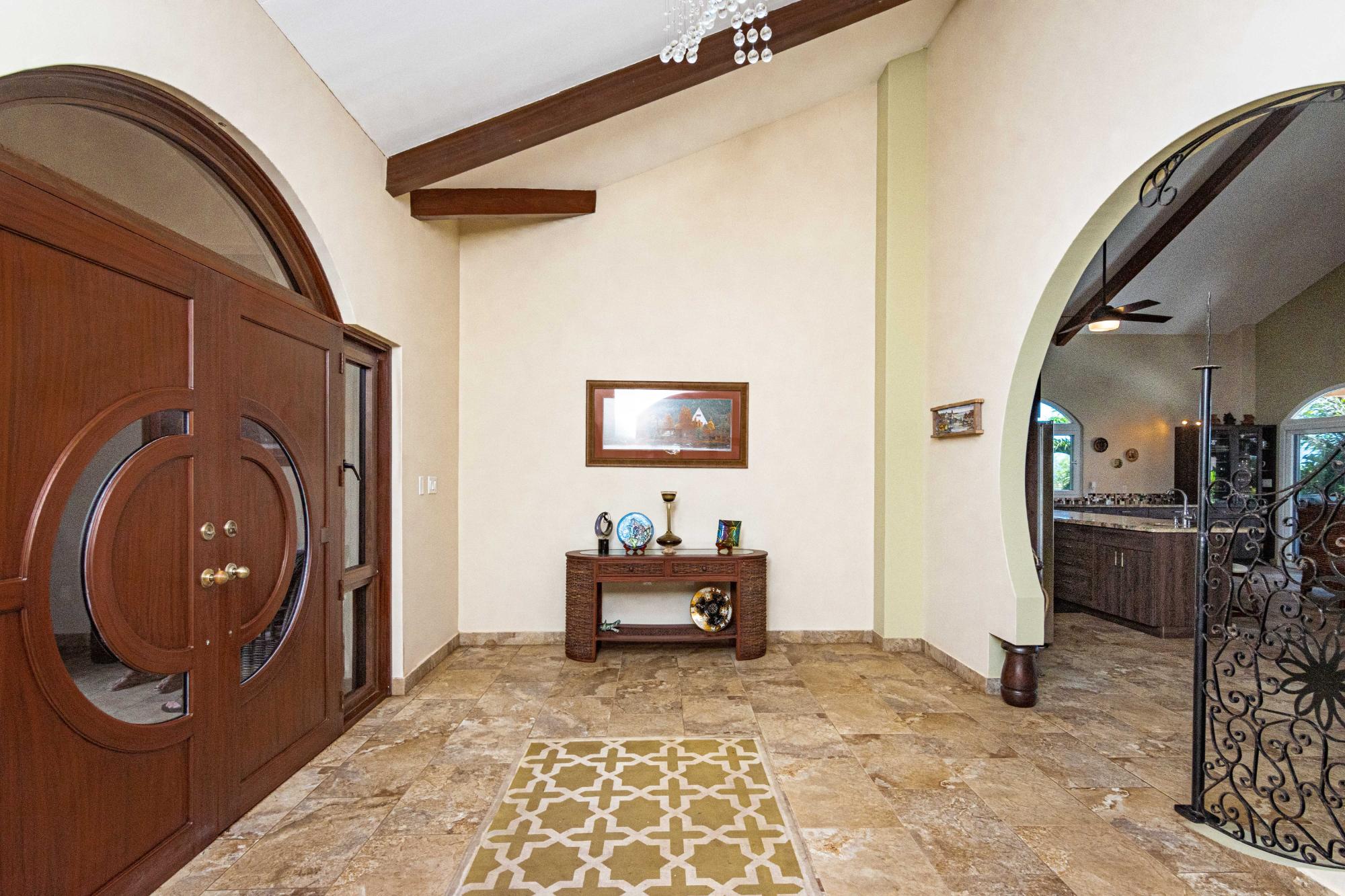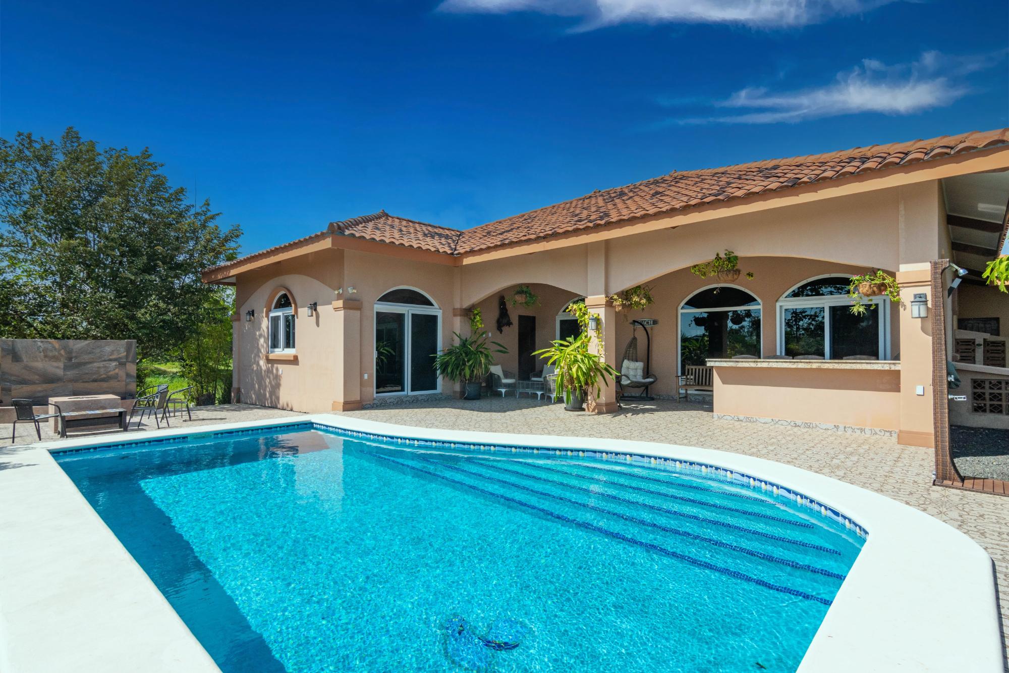 Esta hermosa casa personalizada en la comunidad cerrada frente a la playa de Costa Pedasi fue construida en 2016. La casa fue diseñada para ofrecer la combinación perfecta de vida interior y exterior, con amplias habitaciones, una increíble "gran sala" de planta abierta y un gran patio trasero. Terraza y zona de piscina con zonas de sombra y zonas de sol para adaptarse a cualquier momento del día y cualquier tipo de clima. De pie frente a la casa, su atención se centra en las puertas de madera del garaje personalizadas y la enorme puerta de entrada personalizada. Al entrar al espacioso vestíbulo, gire a la derecha para visitar los dormitorios y el estudio, o siga recto a través de un hermoso arco circular hacia la gran sala, que es el punto focal de la casa. La cocina, el comedor y la sala de estar de planta abierta de la casa son perfectos para el entretenimiento. La gran sala tiene techos altos, iluminación personalizada y mucho espacio en el mostrador de granito. Desde aquí puede dirigirse al área de entretenimiento al aire libre o girar hacia una gran despensa y el garaje cerrado para 2 autos más allá. Terraza de la piscina al atardecer Cubierta de la piscina Las puertas corredizas de vidrio conducen a la terraza privada del patio trasero y a la piscina, con espacios de terraza cubiertos y abiertos que cuentan con una fogata a gas y una fuente de agua que se ilumina por la noche. Es un hermoso lugar para que disfruten sus familiares y amigos. La casa y los terrenos están llenos de mejoras y extras. Por nombrar sólo algunos, la casa tiene su propio pozo de agua privado con tanque de almacenamiento y sistema de doble filtración. La casa tiene una caja eléctrica de 175 amperios y energía trifásica, todo respaldado por un generador Generac de 3kw con función de arranque automático. El patio con hermosos jardines tiene un paisaje maduro y un sistema de riego automatizado.