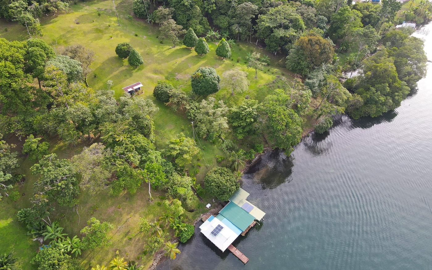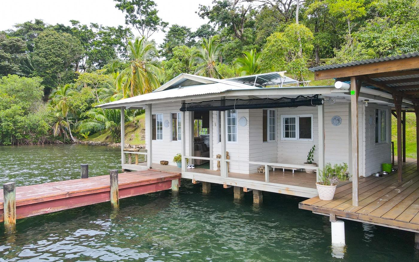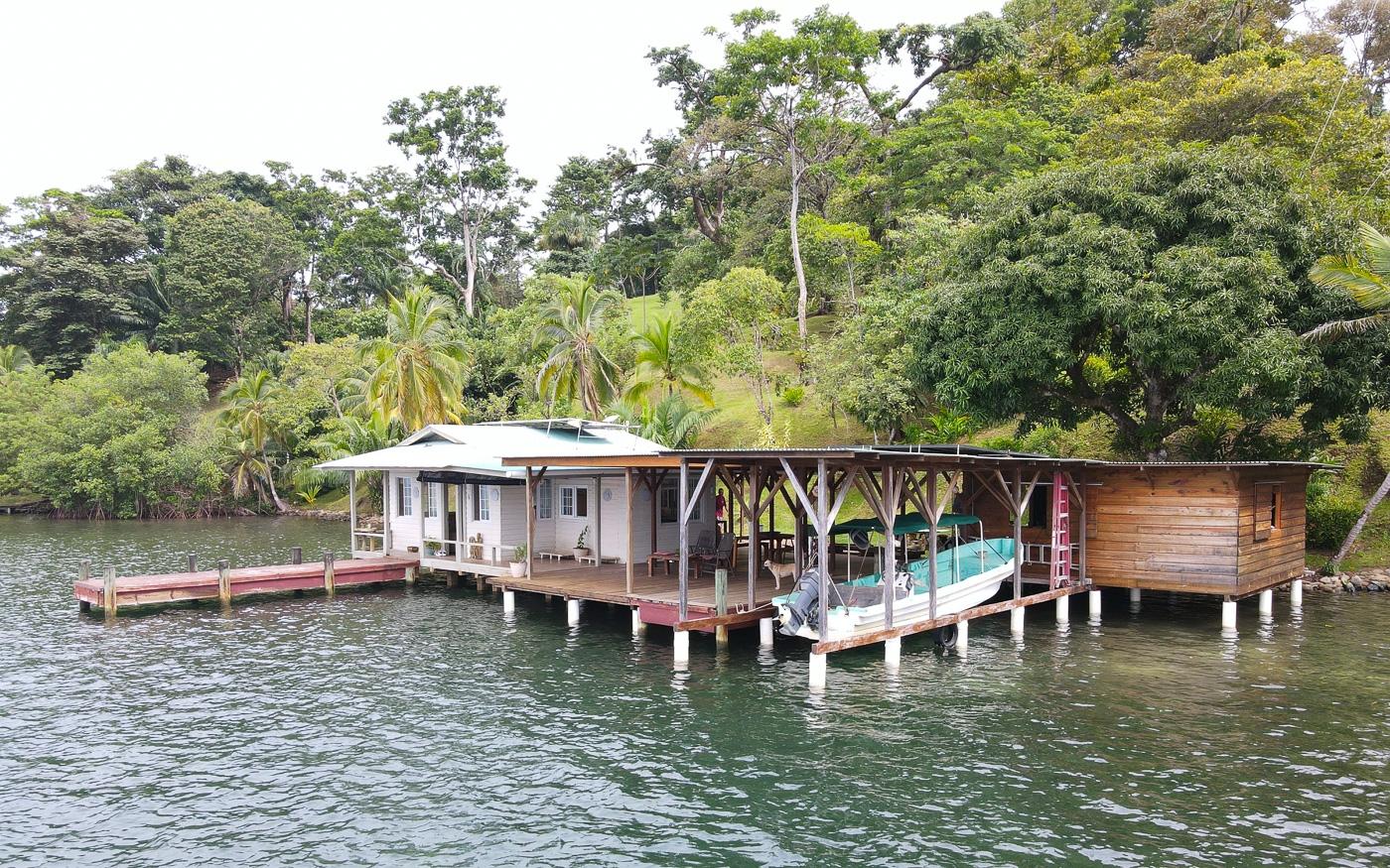 Con orientación norte, excelente elevación y 117 metros de frente al mar, este lote de 2 hectáreas ofrece impresionantes vistas de la costa salpicada de islas del sistema Laguna Sur de Bocas del Toro. Al menos dos hermosos terrenos para construir adornan la cuidada ladera de la propiedad, donde la brisa del norte es constante. El terreno está plantado con árboles maduros de mango, pomarrosa, piña, plátanos y bananos. ¡Lo más emocionante de esta propiedad son los dos manantiales de agua dulce! Imagine relajarse en una refrescante piscina infinita natural disfrutando de las vistas. Una encantadora cabaña sobre el mar le da la bienvenida al pie de un impresionante terreno. Con una distribución tipo estudio, la cabaña cuenta con sala de estar y dormitorio combinados, con un baño en la parte trasera y una cocina independiente a un lado. El espacio se abre a un patio cubierto de 16 m² con comedor, y al otro lado hay un cobertizo para botes con ascensor y un taller donde se encuentran los sistemas aislados, que incluyen un generador de emergencia y baterías de litio de un año de antigüedad.