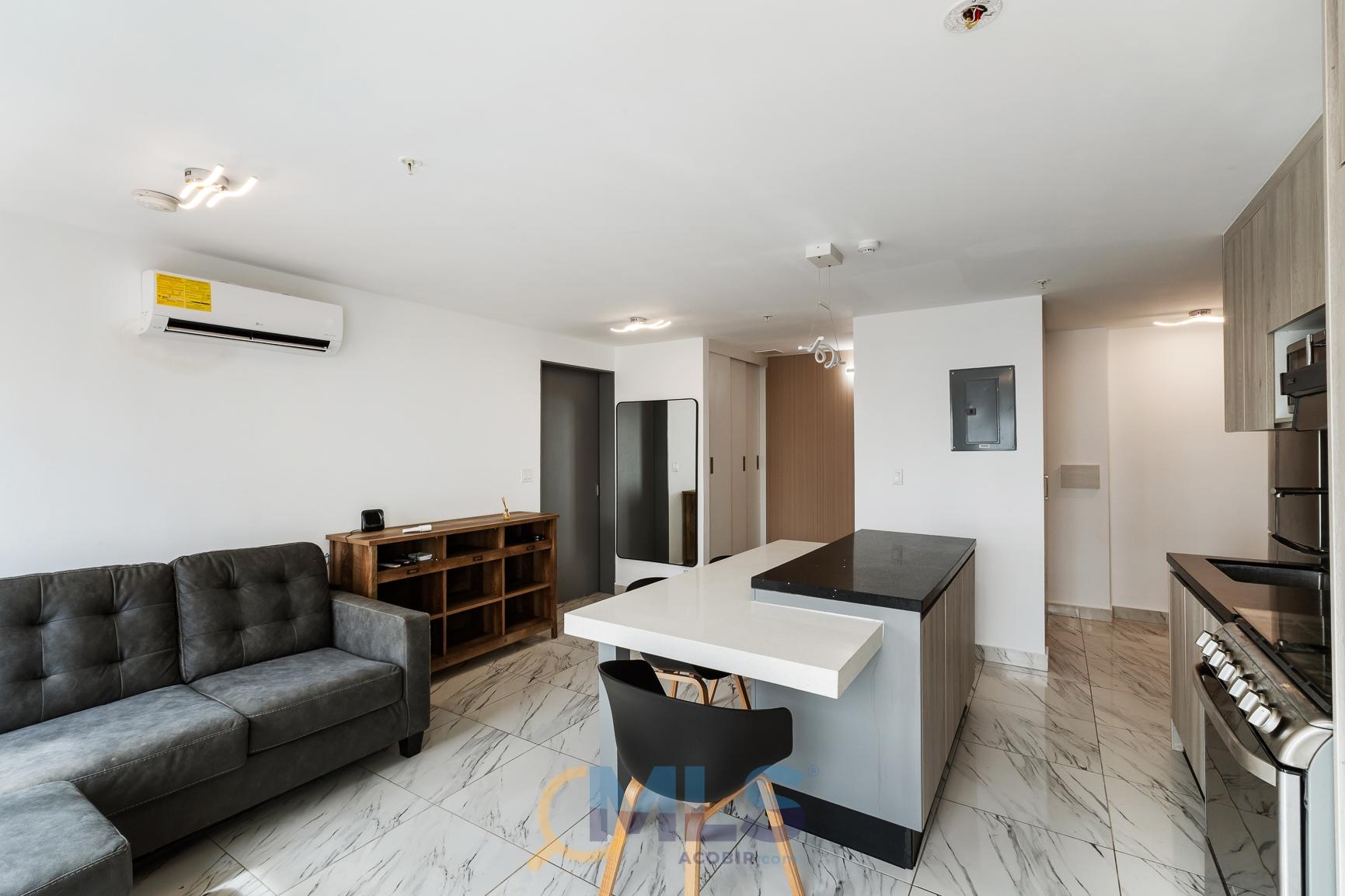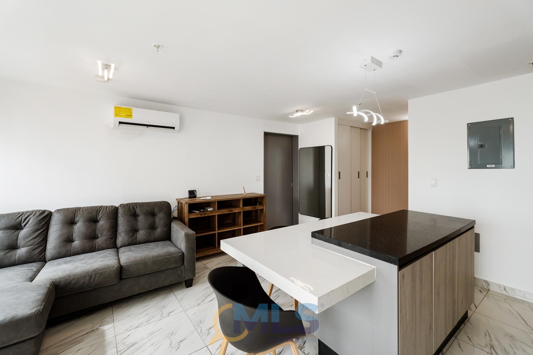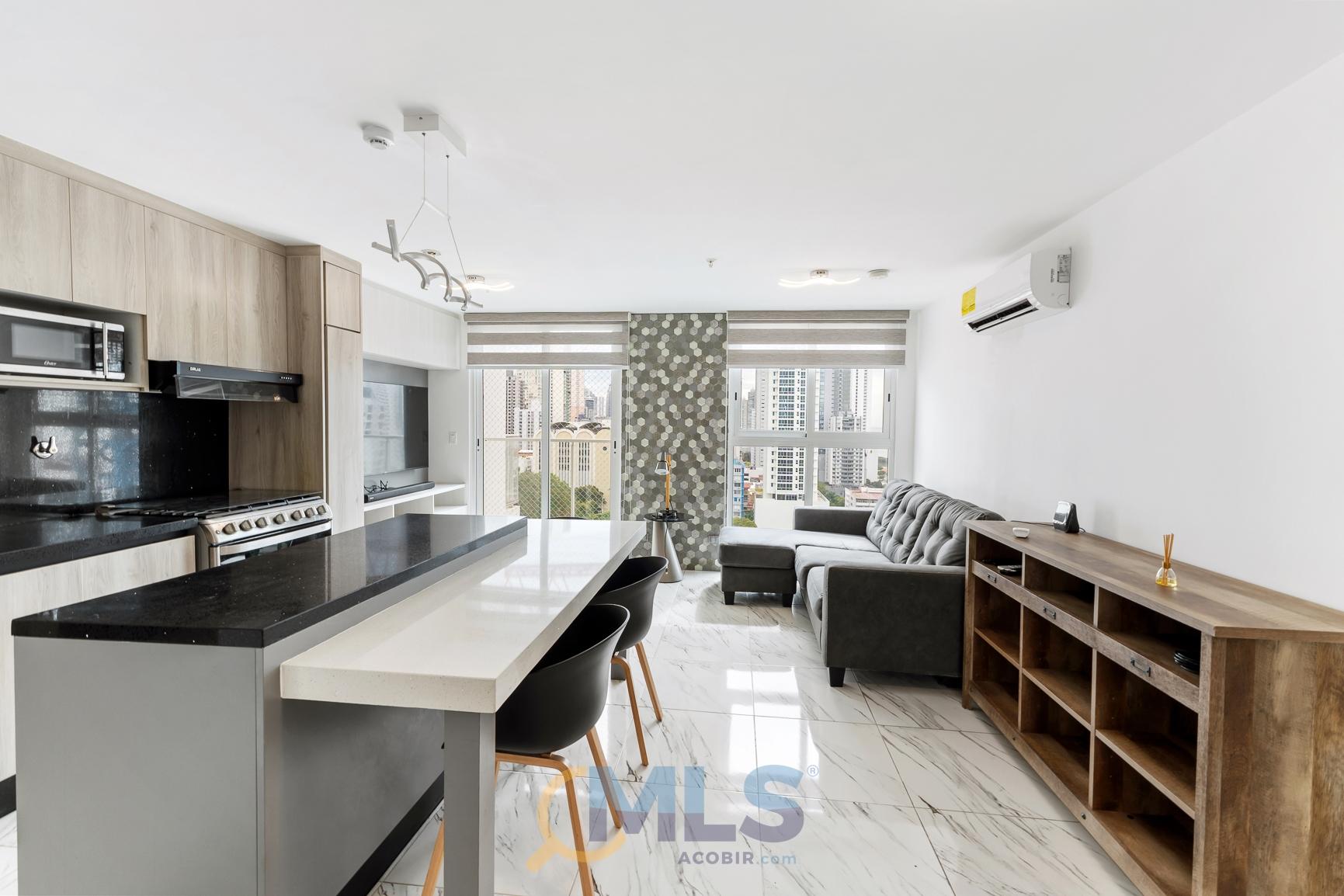 Apartamento de 1 habitación, amoblado y completamente remodelado con estratégica ubicación en Bella Vista, cerca de estaciones del metro, hospitales y con fácil acceso a diferentes vías principales de la Ciudad. Cuenta con 59 m2, con 1 habitación con dos closets lineales y baño privado. Sala-comedor con balcón, cocina integrada con isla que funciona como comedor. Closet de blancos. Pequeño espacio para oficina. Closet de lavandería. 1 estacionamiento en pool (no asignado). El edificio PH El Botánico en Bella Vista, fue construido en 2022 y cuenta con área social con piscina, área de co-working, juegos para niños, área para BBQ y área indoor para mascotas.