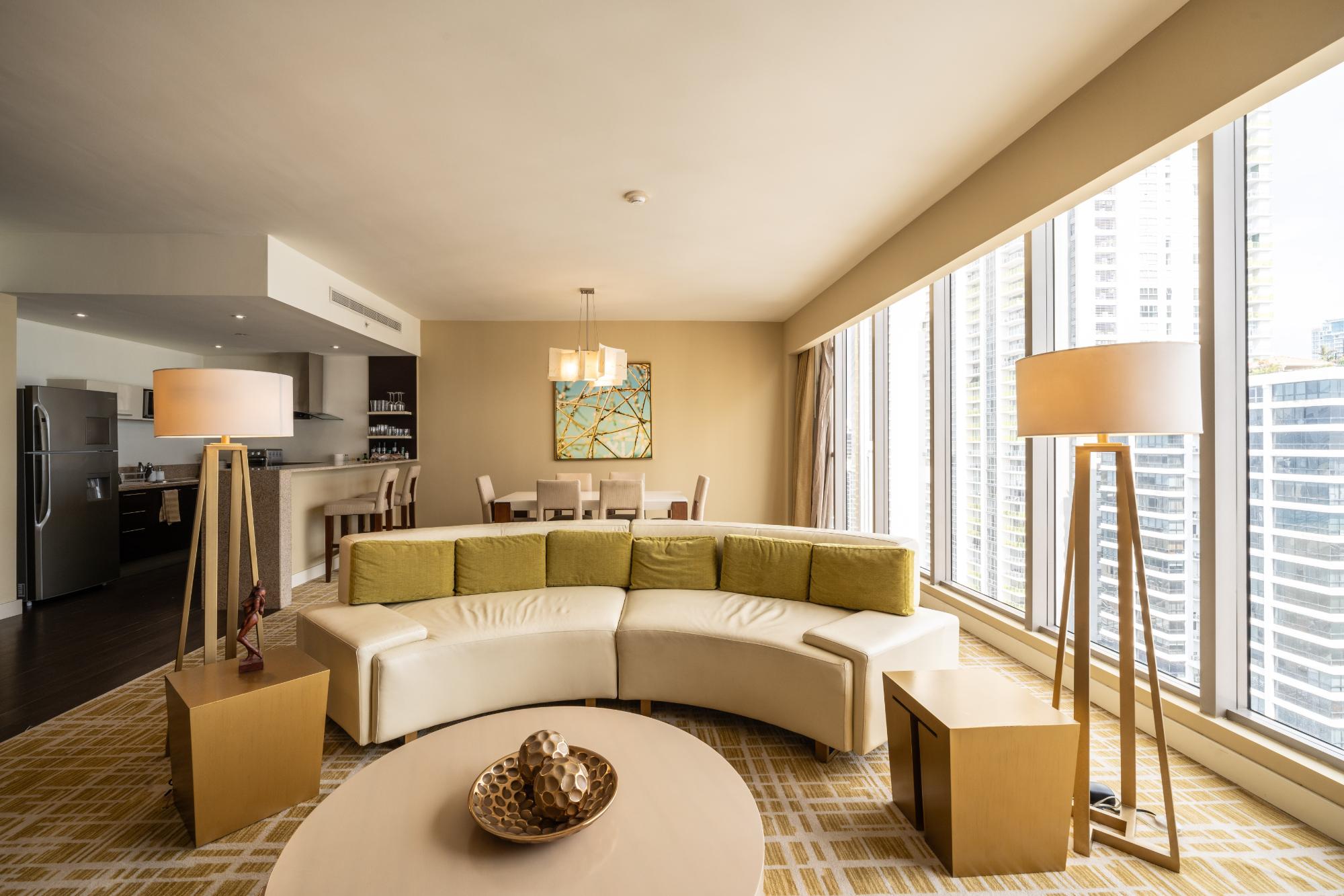 Apartamento ubicado en el piso 30 con vista a la ciudad. Sala-comedor, 1 recamara, 1 baño, aire central y lavandería. El edificio cuenta con muchísimas amenidades como restaurantes, bares, spa, piscina y una excelente ubicación, cerca de centro comerciales, hospitales, cinta costera y casco viejo.